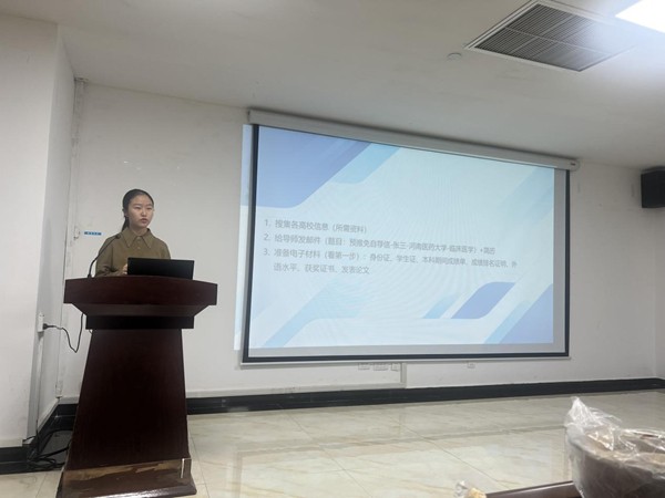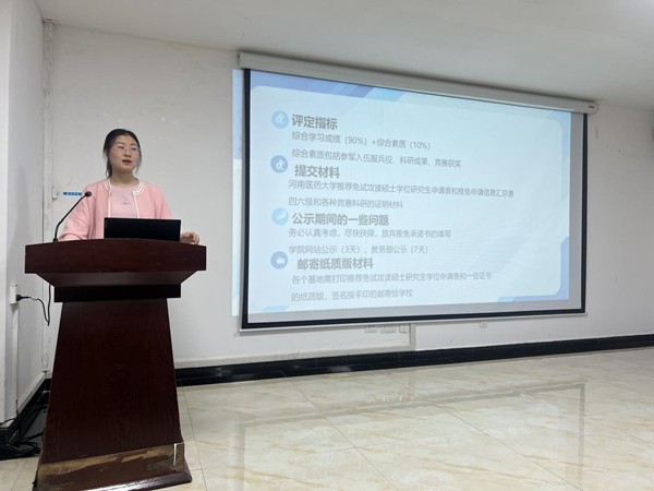 为帮助学生明晰推免路径、把握升学机遇,会议特邀河南医药大学首届推免生赵申宁、郭靖进行经验分享。围绕资格评定、信息搜集、导师联系等关键环节,结合自身经历提出务实建议,强调要做好规划,从现阶段起系统整理学术成果、科研实践与综合素质材料,为未来申请奠定坚实基础。
